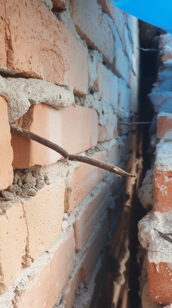 Bestyrelsen kender til to medlemmer der har konstateret omfattende gennemtæring af murbindere i gavlen. Nedenstående billede viser en gennemtæret murbinder fra én af disse gavle. I begge tilfælde er gavlmurene blevet sikret ved indboring af nye, korrosionsbestandige murbindere.